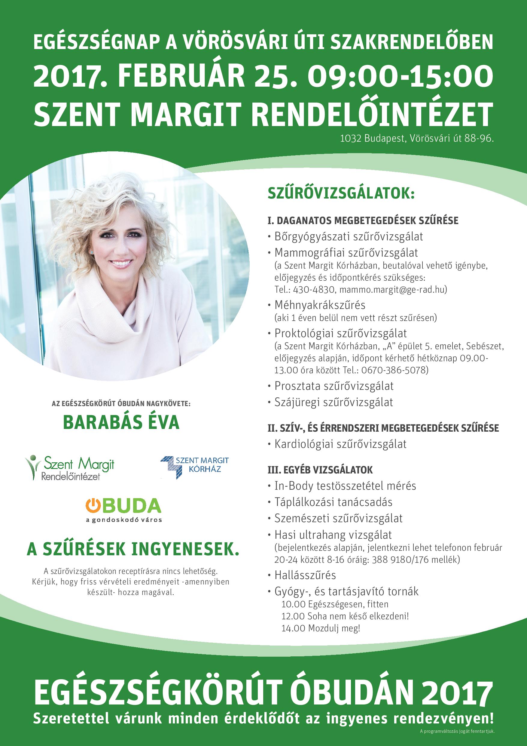 A Szent Margit Rendelőintézet és Óbuda-Békásmegyer Önkormányzata a betegségmegelőzés fontosságát hirdetve indította útjára évekkel ezelőtt az Egészségkörút Óbudán rendezvénysorozatot. Barabás Éva, az ismert műsorvezető 2017-ben is vállalta a rendezvény nagyköveti tisztségét.