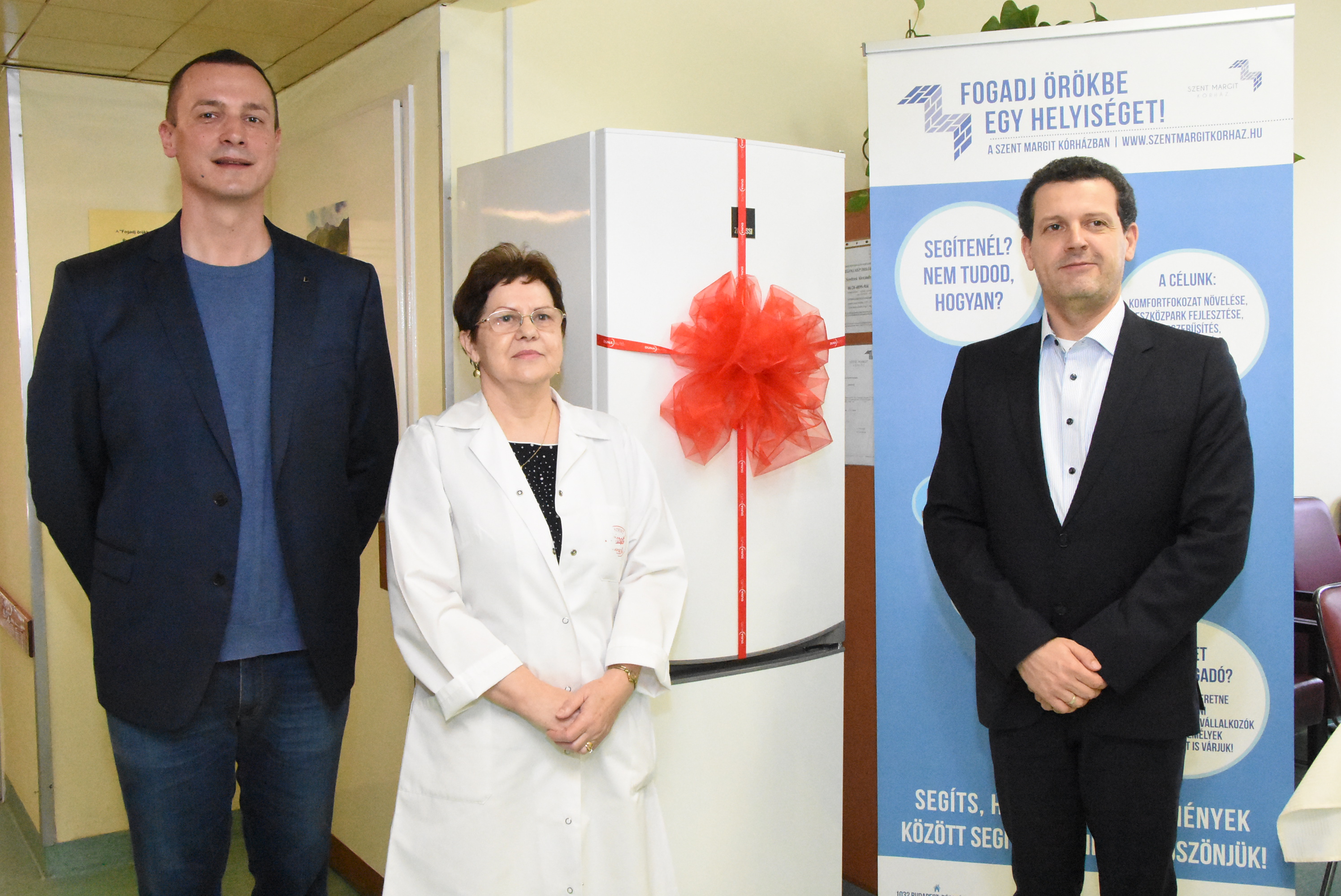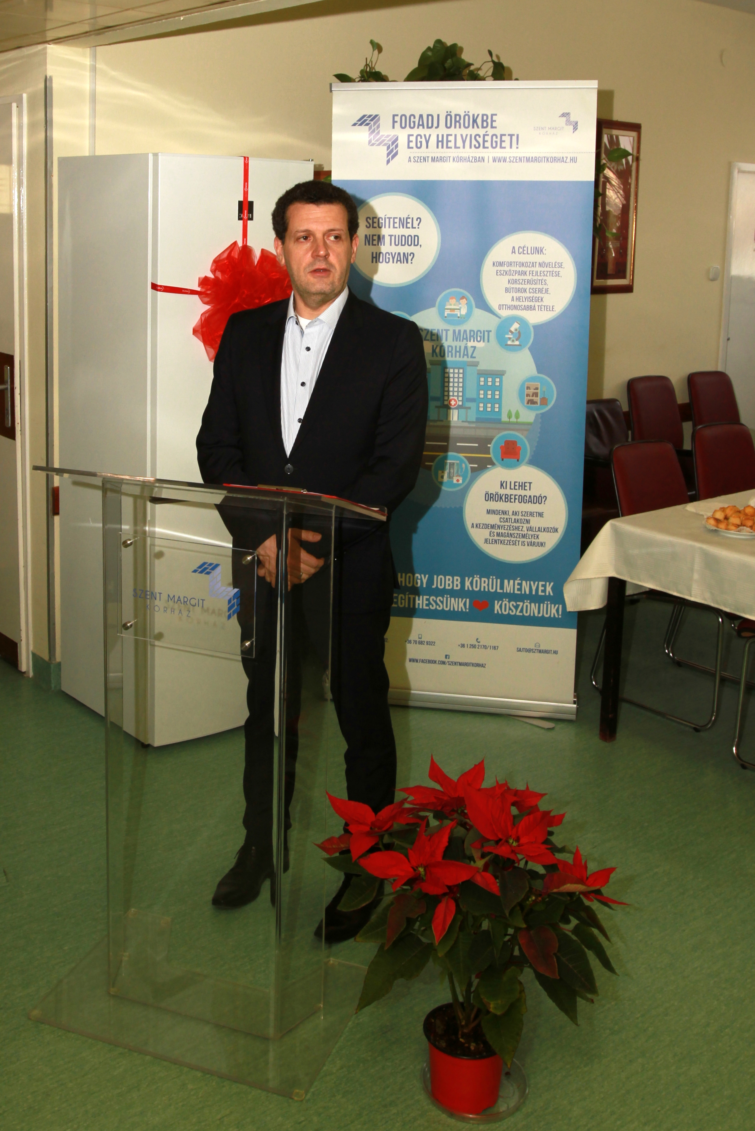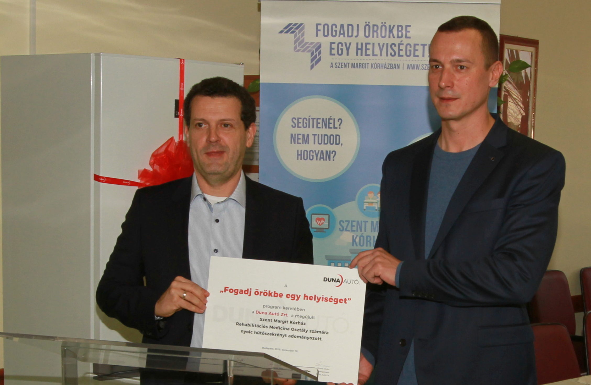 Dr. Badacsonyi Szabolcs főigazgató köszönetét fejezte ki az adományokért, jó példaként említette a Társaság közösségi szerepvállalását, a „Fogadj örökbe…” civil kezdeményezés kapcsán. A Főigazgató beszédében külön kiemelte az adomány hasznosságát a betegellátó osztályok számára. Kiemelte, hogy példamutató a Szent Margit Kórház és a Duna Autó Zrt együttműködése, megerősítve ennek a civil adománygyűjtő kampánynak évek óta töretlen sikerét, egyben reményét fejeztek ki, hogy más kerületi vállalkozások is követik majd a példát. Az átadás alkalmából rendezett ünnepségen Ormos Péter igazgató elmondta, hogy a Társaságuk számára mindig is kiemelten fontos volt a helyi szintű társadalmi felelősségvállalás. Több szociális intézményt, szervezetet támogattak a III. kerületben közöttük –immár harmadik alkalommal- a Szent Margit Kórházat.  Kiemelte, hogy Karácsony közeledtével nagyobb figyelmet kell fordítani beteg embertársaink segítésére.   Örömmel adta át az 500.000 Ft értékben vásárolt hűtőszekrényeket, dr. Badacsonyi Szabolcs főigazgatónak és dr. Tomkó Éva főorvosnőnek a Rehabilitációs Medicina Osztályon. A többi berendezést hét különböző osztályon üzemelték be, ahol nem csak az ételek tárolását könnyítik meg ezek az eszközök, de a szigorú előírásoknak megfelelően a gyógyszerek hűtésére is alkalmasak lesznek.