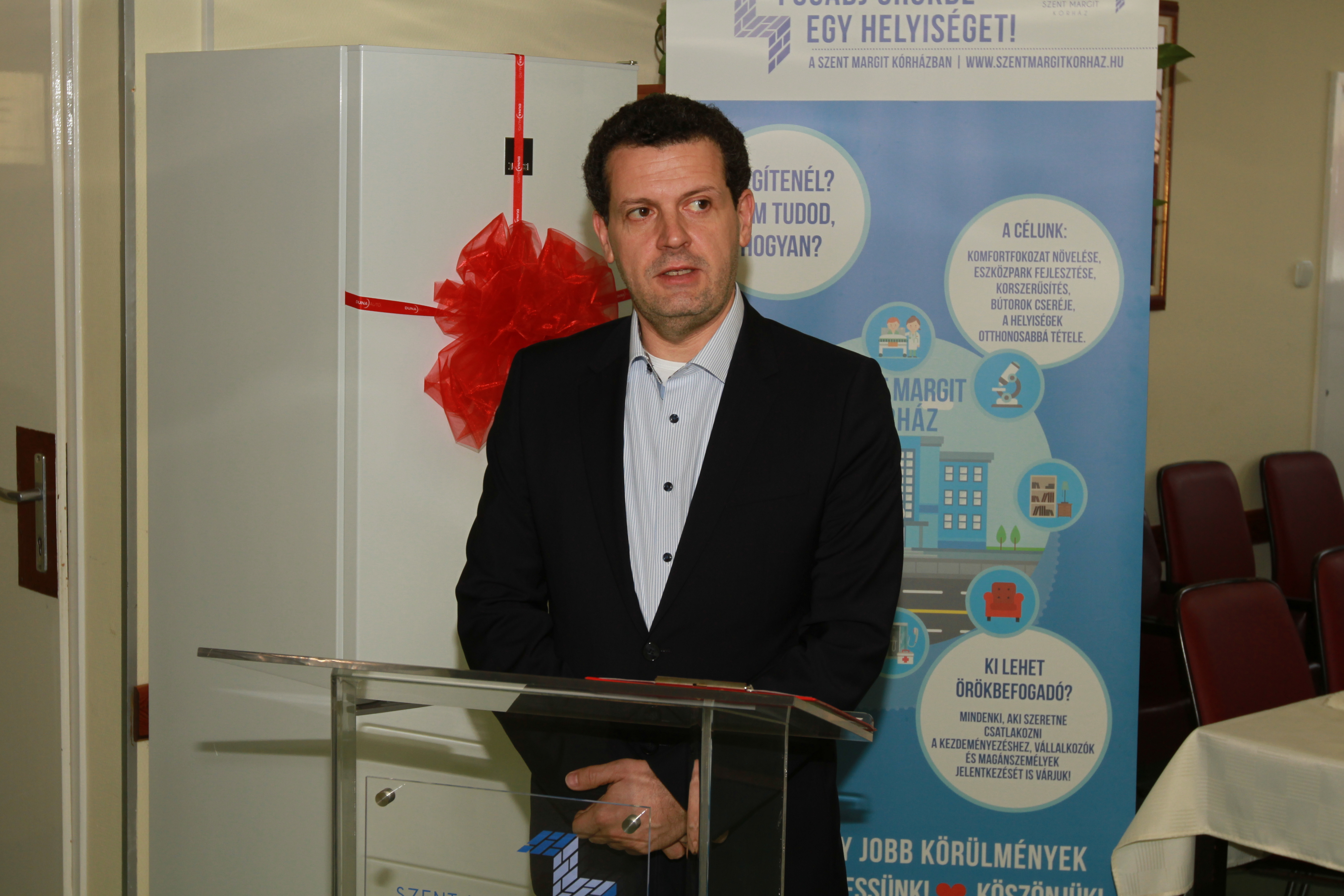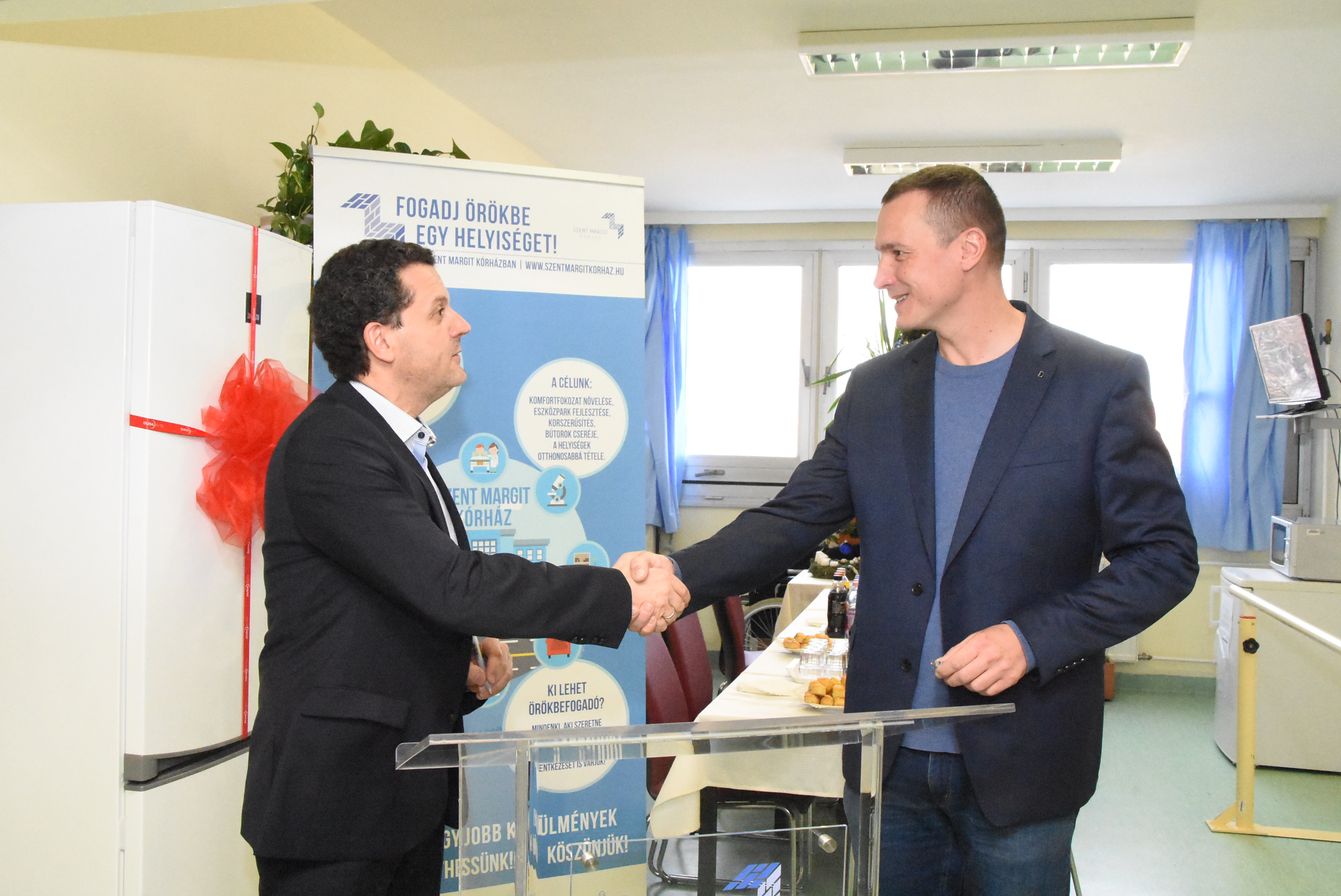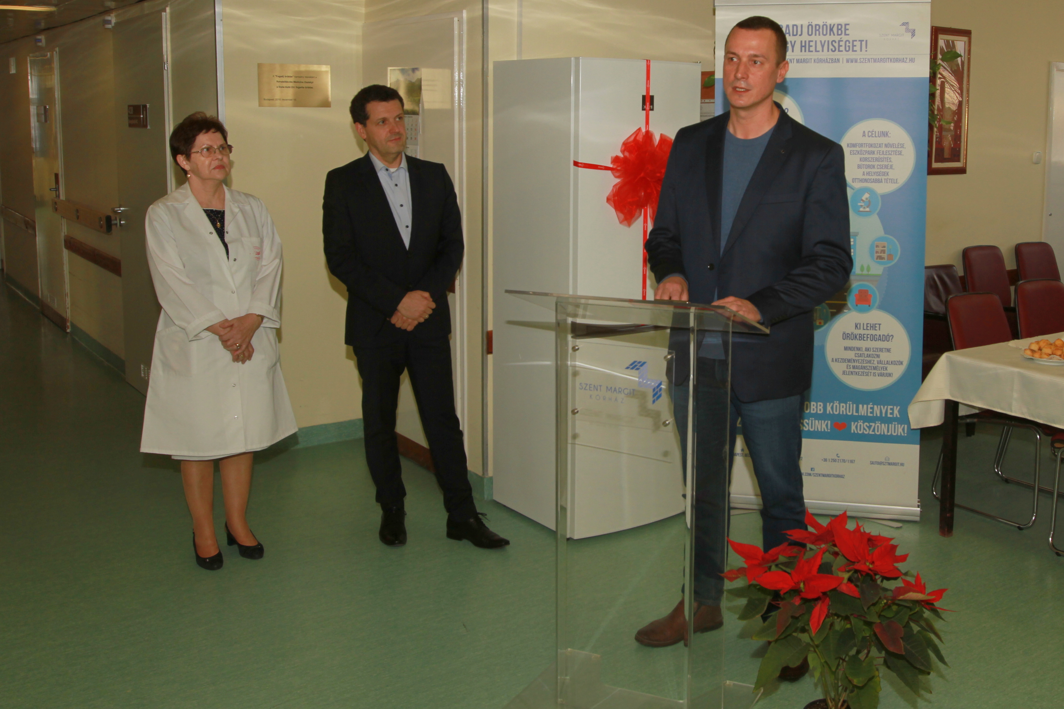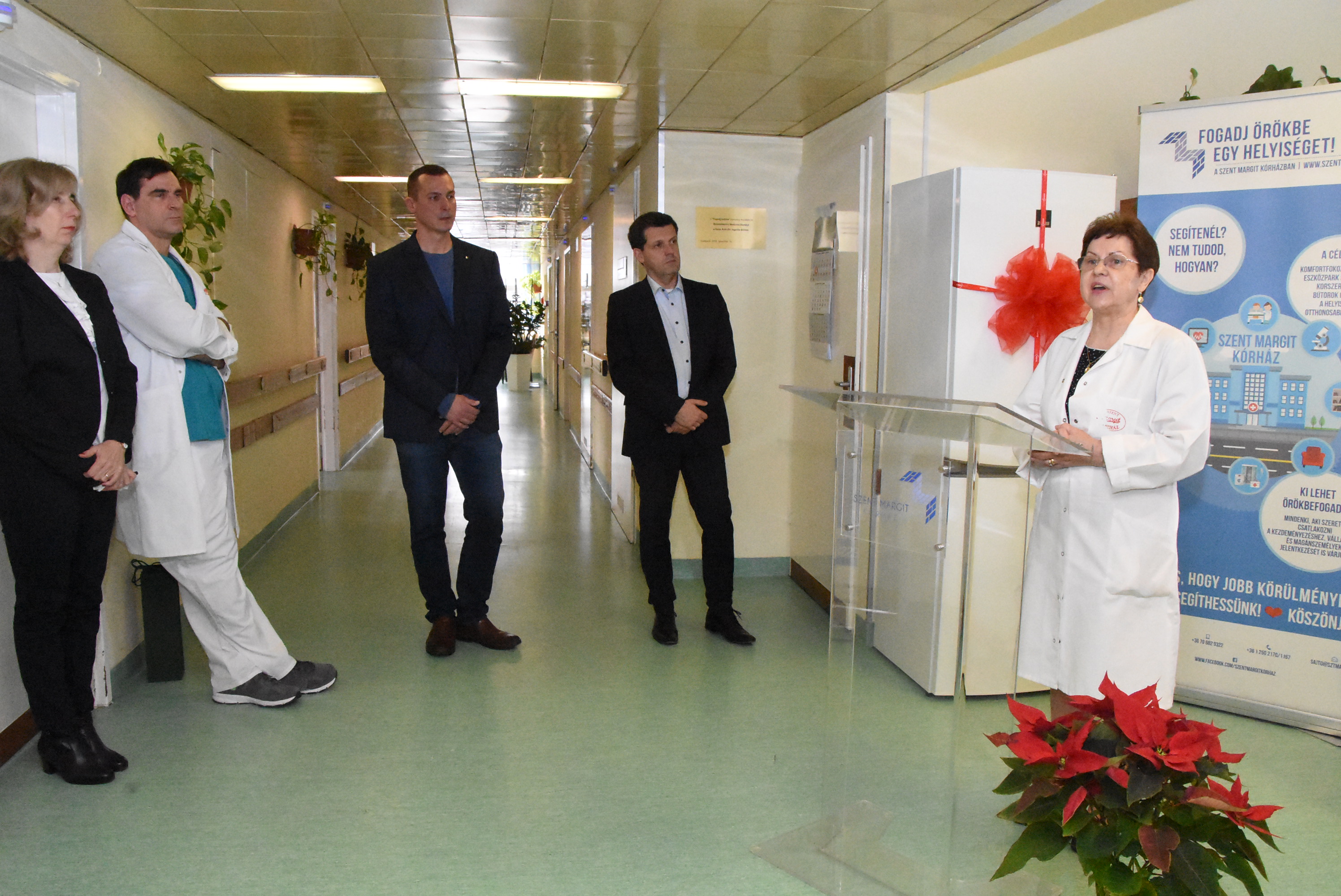 Dr. Badacsonyi Szabolcs főigazgató köszönetét fejezte ki az adományokért, jó példaként említette a Társaság közösségi szerepvállalását, a „Fogadj örökbe…” civil kezdeményezés kapcsán. A Főigazgató beszédében külön kiemelte az adomány hasznosságát a betegellátó osztályok számára. Kiemelte, hogy példamutató a Szent Margit Kórház és a Duna Autó Zrt együttműködése, megerősítve ennek a civil adománygyűjtő kampánynak évek óta töretlen sikerét, egyben reményét fejeztek ki, hogy más kerületi vállalkozások is követik majd a példát. Az átadás alkalmából rendezett ünnepségen Ormos Péter igazgató elmondta, hogy a Társaságuk számára mindig is kiemelten fontos volt a helyi szintű társadalmi felelősségvállalás. Több szociális intézményt, szervezetet támogattak a III. kerületben közöttük –immár harmadik alkalommal- a Szent Margit Kórházat.  Kiemelte, hogy Karácsony közeledtével nagyobb figyelmet kell fordítani beteg embertársaink segítésére.   Örömmel adta át az 500.000 Ft értékben vásárolt hűtőszekrényeket, dr. Badacsonyi Szabolcs főigazgatónak és dr. Tomkó Éva főorvosnőnek a Rehabilitációs Medicina Osztályon. A többi berendezést hét különböző osztályon üzemelték be, ahol nem csak az ételek tárolását könnyítik meg ezek az eszközök, de a szigorú előírásoknak megfelelően a gyógyszerek hűtésére is alkalmasak lesznek.