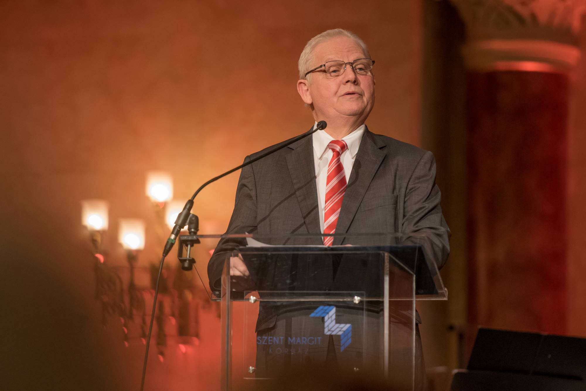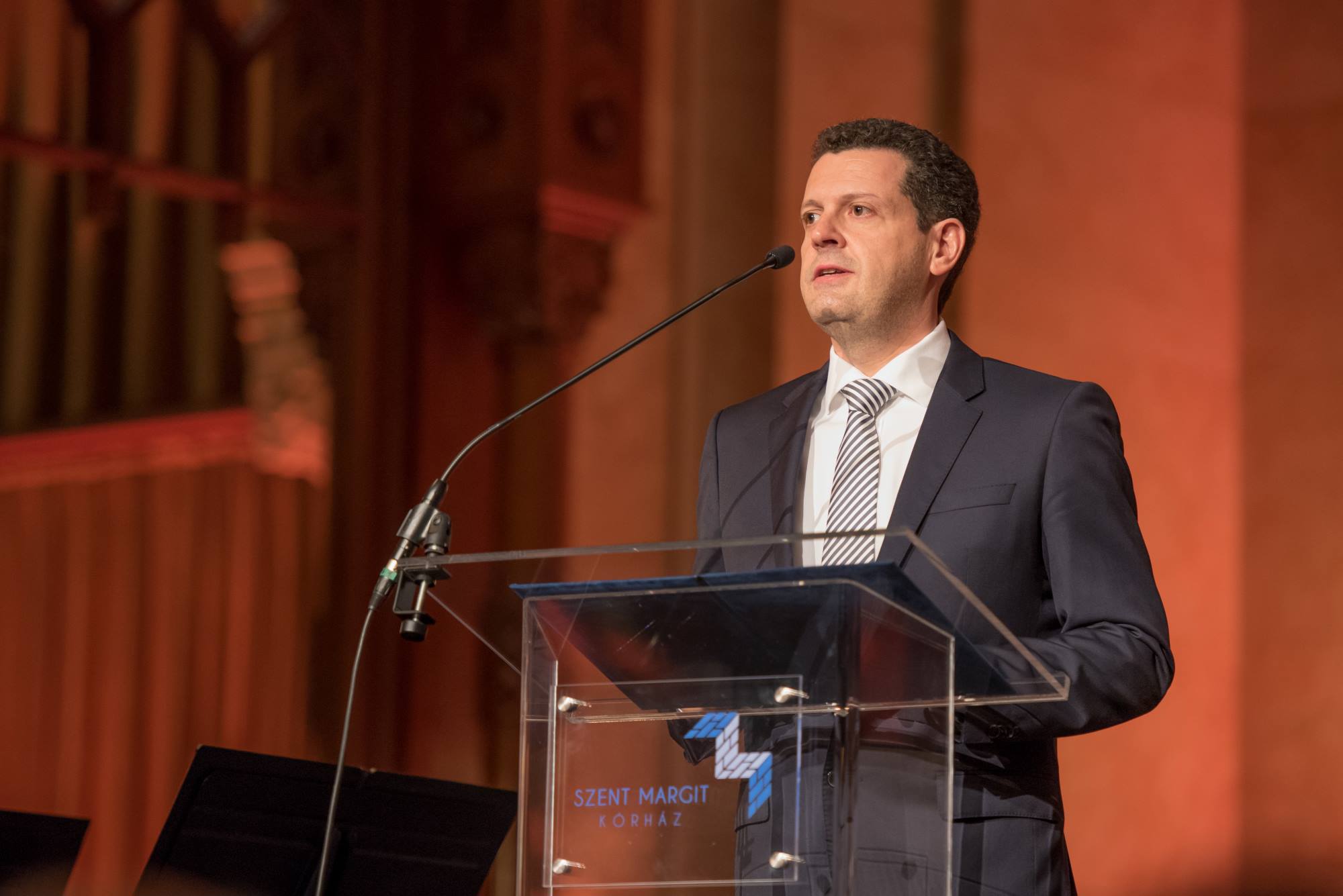 A Jótékonysági Esten elsőként dr. Badacsonyi Szabolcs, a Szent Margit Kórház főigazgatója állt színpadra és köszöntötte a jelenlévőket. „Megtisztelő és egyben felemelő érzés itt állnom Önök előtt ebben a gyönyörű teremben annak a Szent Margit Kórháznak a vezetőjeként, amely oly közel áll a szívemhez, és amelynek 120 éves fennállását köszöntjük a mai jótékonysági esttel… Az Irsay Arthur, Örlős Endre vagy éppen Markovits György nevével fémjelzett örökség bizony komoly kihívást jelent számunkra, akik 2017-ben a jövő Margit Kórházát szeretnénk megteremteni. Most rajtunk a sor. Az elmúlt öt évben sokat dolgoztunk azon, hogy a Margit Kórház számára reális jövőképet alkossunk, céljainkat pedig lépésről lépésre meg is valósítsuk. Magunk és a minket támogató közösség erejéből számos lépést már meg is tettünk. A hamarosan útjára induló Egészséges Budapest Program ugyanakkor arra teremthet esélyt számunkra, hogy a Szent Margit Kórház a következő években – mintegy 20 milliárd forint költségvetési forrásból -teljes egészében megújuljon, sőt a lehető legszínvonalasabb, legnagyobb biztonságot jelentő ellátást, a lehető leghatékonyabb infrastruktúrában és eszközökkel legyünk képesek nyújtani a hozzánk forduló betegek számára.” Főigazgató Úr beszéde zárásaként köszönetet mondott valamennyi munkatársának, a támogatóknak, valamint az Est védnökséget elvállaló Varga Mihálynak, Tarlós Istvánnak és Bús Balázsnak, hogy segítik és támogatják a Kórház céljainak elérését.