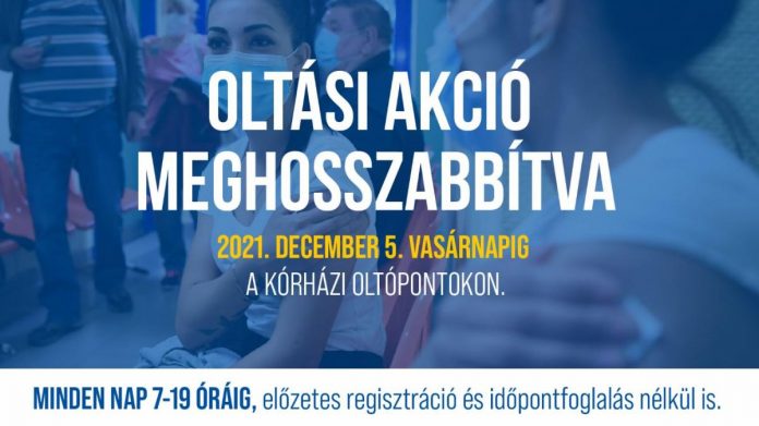Meghosszabbította a kormány a november 22-én kezdődött Oltási akcióhetet, így az új időpont szerint december 5. vasárnap estig lehet kórházunk oltópontjain előzetes regisztráció és időpontfoglalás nélkül oltakozni.
