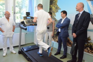 Dr. Plavecz Julianna osztályvezető főorvos köszönetet mondott az adományozásért, és bemutatta azt a terápiás szakmai munkát, mellyel segítik a hozzájuk érkező betegek mielőbbi gyógyulását. A Mozgásszervi Rehabilitációs Osztályon 35 ágyon végeznek komplex rehabilitációs kezelést. Tevékenységük kiterjed a stroke-on átesettek, a krónikus neurológiai betegséggel élők, a baleseti sérüléses állapotok, a perifériás érbetegségek, illetve a